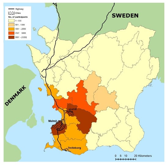 Distribution of the study population of Maternal Air Pollution in Southern Sweden (MAPSS), 1999–2009. Map by Emilie Stroh.