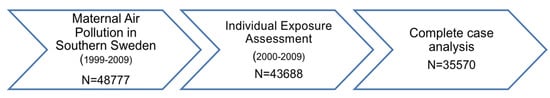 The study was based on a cohort of 43,688 singleton pregnancies during the 2000–2009 period in Scania (Skåne) county in southern Sweden, which has a total population of approximately 1.35 million []. A detailed description of the original birth cohort, Maternal Air Pollution in Southern Sweden (MAPSS), has been previously given by Malmqvist et al. []. MAPSS consists of a local birth register, Perinatal Revision Syd (PRS), connected to individual exposure assessments of air pollution levels at each maternal residential address within the catchment area of hospitals in Malmö, Lund and Trelleborg (Figure 1). PRS is regarded as a high-quality medical birth register with 98% coverage of all births in Scania. Additionally, this birth register is linked to sociodemographic and socioeconomic factors obtained from Statistics Sweden through each person’s unique personal identification number (PIN) [].