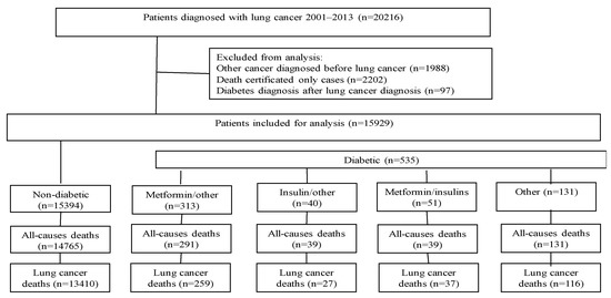 - Luo, J.; Hendryx, M.; Qi, L.; Ho, G.Y.; Margolis, K.L. Pre-existing diabetes and lung cancer prognosis. Br. J. Cancer 2016, 115, 76–79. [Google Scholar] [CrossRef]