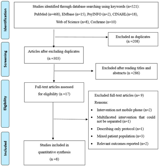 Title and abstract reviews were conducted on the 303 articles, after excluding the duplicates from the initial search. A total of 286 articles were excluded for being irrelevant to the purpose of our systematic review (i.e., examining the effects of mobile phone-based HF intervention that targeted improving self-care on health outcomes). The full text of the remaining 17 articles was reviewed. A total of nine articles were excluded for the reasons described in Figure 1. To ensure reliability, two reviewers (Y.J.S. and H.J.L.) independently reviewed for inclusion. Any disagreements encountered were subsequently resolved by the third reviewer (Y.L.).