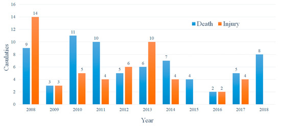 There were 11 catastrophic and fatal occupational accidents associated with confined spaces in 2008 in Taiwan, with a total of 9 deaths and 14 injuries. These casualties accounted for 19% (23/122) of the casualties recorded in the statistical period, and contributed to the passing of the “Occupational Safety and Health Promotion Program” by Taiwan Executive Yuan Taiwan in 2009, which involved eradication of inspection-oriented thinking, adoption of the three-in-one inspection strategy of “promotion, inspection, counseling” to promote the risk management grading inspection system, and establishment of the “Declaration System for Confined Space Work Schedule”. Moreover, the publicity meetings were greatly increased to a total 98; additionally, six experience-sharing conferences on “Confined Space Hazards Prevention” were held [31]. The number of casualties in 2009 was significantly reduced to six people. This plan continued to be implemented until 2010; since then, the number of casualties in confined space accidents has continued to decline steadily.