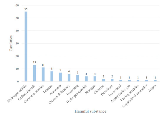 A total 64 accident reports associated with confined spaces were consolidated, as shown in Table 1; in total, 70 deaths and 52 injuries were included. Further analysis, as illustrated in Figure 2, indicated that the harmful substance associated with the highest proportion of casualties was hydrogen sulfide with 45% (55/122), followed by carbon dioxide with 11% (13/122), carbon monoxide with 9% (11/122), toluene with 7% (8/122), and ammonia with 6% (6/122). Therefore, if these five hazards could be eliminated, the proportion of disasters could be reduced.
