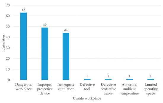 The analysis of non-standard acts conducted via SCAT is displayed in Figure 4, indicating that the highest proportion of direct causes was “failure of operating procedures” with 27% (57/211), followed by “improper personal protective equipment” with 25% (53/211) and incorrect position” with 23% (49/211). In addition, the analysis of non-standard conditions displayed in Figure 5 revealed that “dangerous workplace” had the highest proportion of direct causes with 39% (63/160), followed by “improper protective measures” with 30% (49/160) and “inadequate ventilation” with 27% (44/160).