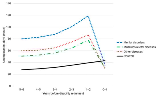 The aim of this study was to assess the role of unemployment in the disability retirement process in a retrospective setting using nationally representative register-based data. We calculated the development of the yearly number of unemployment days during six years before disability retirement among the retirees and their gender- and age-matched controls. As unemployment is more strongly related to mental than physical health problems [12,13], we separately examined those who retired due to mental disorders, musculoskeletal diseases and other somatic diseases. Furthermore, we examined whether the level and development of pre-retirement unemployment differs by socioeconomic status.