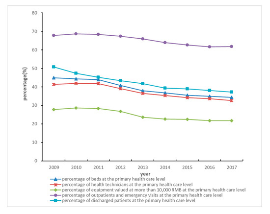 As can be seen from the percentages of PHCI’s input and output indicators in all medical institutions, the outpatients and emergency visits, the discharged patients, health technicians, beds and equipment all showed a downward trend from 2009 to 2017. In addition to beds and discharged patients, other indicators increased significantly from 2009–2011, followed by a significant decline from 2012 to 2014, and a slowdown in 2015–2017 (Figure 1).