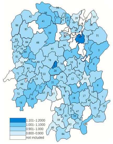 The Malmquist index model was applied to analyses on the changes in productivity over the 2009–2017 period, and the year 2009 was taken as the technical reference. Table 4 presents the Malmquist index summary of annual geometric means. On average, TFP decreased by 3.1%, among which, TECHCH decreased by 6.5% and EFFCH increased slightly by 3.7%. During the period 2009–2017, 24 (27.91%) counties had TFP score greater than 1, indicating growth in TFP; 61 (70.93%) counties had TFP score less than 1, indicating a deterioration in TFP. Figure 2 shows the distribution of TFP in Hunan Province. The most efficient counties are Xiangyin County (30) and Lengshuijiang City (77). The TFP of each county is shown in Table A1, Appendix A.