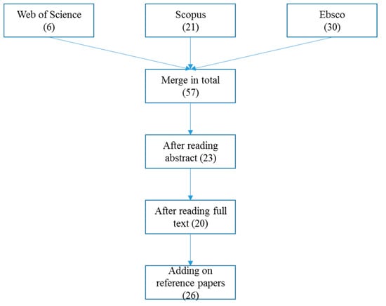 Removing the duplicated papers and applying inclusion and exclusion criteria (Table 1), the number of useful papers was reduced to 26 in the final process (Figure 1). The final 26 papers were categorized and evaluated by the content analysis method, which is a systematic and objective research method that have been used to quantify phenomena, documents, or communications [].