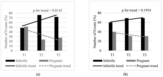 Figure 1 shows the number of events (infertility and pregnancy) according to blood lead (Figure 1a) and blood cadmium (Figure 1b) tertiles. The proportion of infertile to pregnant women shows an increase from the first to second tertile (0.49:0.51 vs. 0.76:0.24) and a decrease from the second to third tertile (0.76:0.24 vs. 0.72:0.28) (Table 2). Overall, the number of infertile women showed a statistically significant increasing trend with increasing blood lead tertiles (p = 0.0145). Although there was an increase in the proportion of infertile to pregnant women from the first to second and third blood cadmium tertiles (0.60:0.40 vs. 0.69:0.31 vs. 0.69:0.31), no statistically significant trend was observed (p = 0.1954) (Table 2).