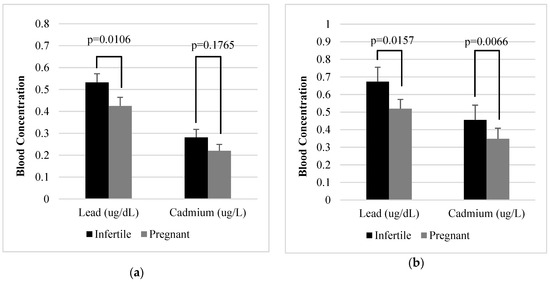 Despite the effect of cadmium and lead exposures on female reproduction in animals, studies on these relationships are limited and conflicting in humans. Although the basis behind such inconsistent outcomes is not readily apparent, factors such as small sample sizes and the inclusion of participants in hospital settings (i.e., from fertility clinics) may contribute to such inconsistencies [17,19]. Up until now, there have been no population-based studies examining these effects. Accordingly, in the present study, we aimed to assess whether blood lead and cadmium levels were associated with self-reported infertility in US women by comparing blood lead and cadmium levels between infertile and pregnant women.