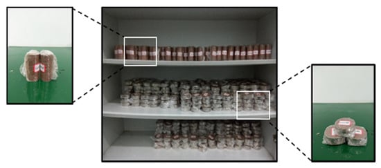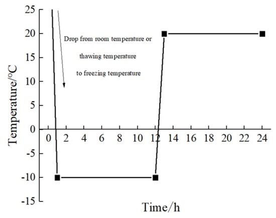 Specimens were air-dried under natural conditions and put into the High and Low-Temperature Alternating Test Box (TC401, Chongqing Taisite Test Instrument Co. Ltd., Chongqing, China, with temperature range: −4~100 °C) for freezing and thawing after the curing process. To allow specimens to be frozen and thawed completely, each freeze-thaw cycle consisted of a constant temperature of −10 °C for 11 h followed by a constant temperature of 20 °C for 11 h. Thus, one freeze-thaw cycle was completed in one day (Figure 2).