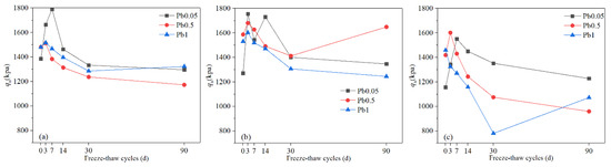 The UCS of Pb-CSCSs with the same compound binder and different contaminant contents: (a) C2.5S5F5; (b) C5S2.5F2.5, and (c) C5S5.
