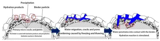 The curves also show that the UCS of Pb-CSCSs were improved in different degrees in the early stage of the freeze-thaw process (0 to 3d or 0 to 7d), due to extensive Pb2+ reactions with the hydroxide generated by binders forming insoluble precipitation, which covers the surface of the binders and makes these unable to make full contact with water, hindering the formation of the hydration products [29,66] which are the main sources of UCS. Thus, for freeze-thaw cycles of 0 to 3d or 0 to 7d, the water in the soil condenses into ice lenses under the action of freezing, causing volume expansion and great pressure within the pores [31], causing the sediments and particles cemented together by hydration to break apart and become dispersed again [33]. The migration and physical state changes of water caused by freezing and thawing [23,30,67] rupture the coating of the precipitate and hydration products so that the water can infiltrate into the gap and produce hydration products after reacting with binders (Figure 4). Although the freezing-thawing cycle damages the soil structure to a certain degree, it was not the main factor dominating the UCS where the number of freeze-thaw cycles was relatively small.