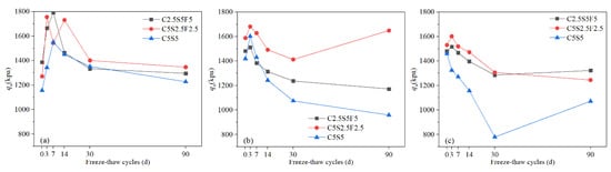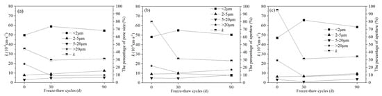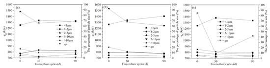 Based on the relationship between UCS and particle size distribution in Pb-CSCSs (Figure 16), it can be seen that in the early stage of freeze-thaw process (0 to 30 d), the number of particles larger than 2 μm in C2.5S5F5Pb1 and C5S2.5F2.5Pb1 decreased smaller than 2 μm increased (Figure 16a,b). In C5S5Pb1, all particles larger than 1 μm decreased, while those smaller than 1 μm increased (Figure 16c), which indicates a more intense crushing effect. At the same time, the UCS of all three kinds of Pb-CSCSs dropped significantly under 30d freeze-thaw cycles, with the UCS of C5S5Pb1 decreasing most sharply. This indicates that the larger particles in Pb-CSCSs were broken under freeze-thaw cycles, reducing the UCS; the smaller the maximum particle size of the broken particles, the more dramatically the UCS deteriorated.