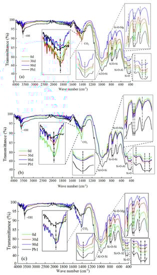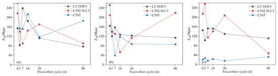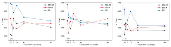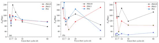However, when the Pb2+ content increased to 1%, the friction angle was significantly smaller than in C5S5Pb0.05 and C5S5Pb0.5. This might be caused by the generation of a large amount of Pb(OH)2, which would prevent further cement hydration. Although the friction angle increased significantly when the freeze-thaw cycle increased from 0d to 3d, this may be due to more precipitation and the crushing of solidified particles by freezing and thawing leading to an increase in the internal friction angle. With the increase in the number of freeze-thaw cycles, more precipitation would thus have prevented hydration from being stimulated by the freeze-thaw cycle, and thus the continuous degradation of the freeze-thaw cycle would predominate, resulting in a significant decrease in the internal friction angle and making it significantly smaller than those of the other two Pb-CSCSs. The occurrence of large differences in internal friction angles once again suggests that a critical content level may exist between 0.5% and 1%.