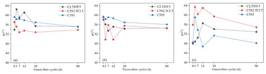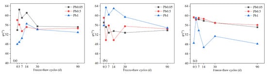There were small changes in the φ of Pb-CSCSs after a certain number of freeze-thaw cycles (30d). In particular, the φ values of C5S5Pb0.05 and C5S5Pb0.5 were relatively stable during the entire long-term freeze-thaw process (Figure 8c and Figure 9a,b), showing good resistance to long-term freeze-thaw cycles. This indicates that when the content of Pb2+ is low (0.05%, 0.5%), and the content of lime and fly ash are 5% and 0%, respectively, the binders are highly hydrated before freezing and thawing so that φ is stable and slightly reduced under the comprehensive influence of the continuous deterioration and improved particle grading and shape caused by freeze-thaw cycles. In addition, in all three kinds of Pb-CSCSs, the variation characteristics in φ were similar when the pollution levels were 0.05% and 0.5%, indicating that, under the combined effect of the pollutants in this content range and the freeze-thaw cycle, the geometric arrangement and shape of soil particles did not change significantly, in agreement with Li et al. [73].