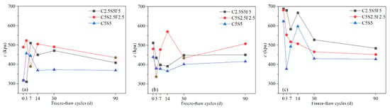 Cohesion depends on the distance between particles, the number of contact points per unit surface area of the particles, and various physical and chemical forces between the particles, including the Coulomb force (electrostatic force), van der Waals force, and cementation force. Fluctuations of the cohesion of Pb-CSCSs were observed as seen in Figure 10, and further observations showed that the cohesion generally improved with the increase of Pb2+ content, especially when the Pb2+ content of Pb-CSCSs was 1% (Figure 11c), where the cohesion was almost always greater than that of Pb-CSCSs with lower Pb2+ content (0.05% and 0.5%) throughout the freeze-thaw process. This can be attributed to the adsorption that is the main mechanism of Pb2+ solidification [74,75], as soil particles become negatively charged due to edge breakage, ion exchange, and dissociation of hydrogen in the hydroxyl group. A diffuse electrical double layer (DDL) thus exists between the soil particles, and its thickness is an important factor affecting the cohesion of the soil. The appearance of Pb2+ in pore water fluid reduced the thickness of hydrated film and DDL between the soil particles, resulting in reduced osmotic repulsion and increased van der Waals force attraction among the clay [67,73,76]. Hence, the particles were bonded more firmly, contributing to increased cohesion. Additionally, the formation of pollutant precipitates filled the pores between the particles to a certain extent, reducing the distance between the particles. The contact points between the particles increased, macroscopically generating a significant improvement in cohesion [77]. The cohesion decreased sharply in all three kinds of solidified contaminated soil with increases in the freeze-thaw cycle when Pb2+ content was 1% (Figure 11c), however, and it was significantly lower than the initial value after 90 days of freeze-thaw. In contrast, when the Pb2+ levels were 0.05% (Figure 11a) and 0.5% (Figure 11b), the cohesion of the samples was relatively close during the freeze-thaw cycles, and the final cohesion was only slightly decreased, or even increased, from the initial value. Although increased Pb2+ can greatly improve initial cohesion, a large amount of precipitation seriously impedes the activation of hydration in later freezing-thawing cycles. The degradation of cohesion caused by freezing-thawing cycles thus dominates. Moreover, even with different contamination levels, the cohesion of samples solidified by the same compound binder tended to level off to an equal value. The reason for this trend could be that the shape, size, and spacing of soil particles tends to be more homogeneous as the freeze-thaw process progresses, which causes similar cohesion.