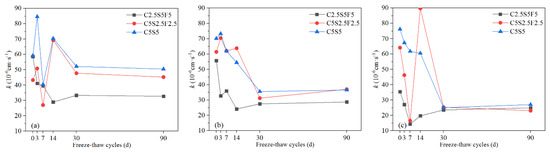 As shown in Figure 12, the permeability coefficient of Pb-CSCSs fluctuated and finally decreased over increases in freeze-flow cycles. The variation characteristics of the permeability coefficients of Pb-CSCSs with three different Pb2+ contents solidified with C2.5S5F5 were very similar throughout (Figure 12a). In the initial stages of freeze-thaw cycles, the permeability coefficient gradually decreased as the freeze-thaw cycles increased, then on reaching a certain point (7d or 14d), it began display a slight upward trend and eventually levelled out. This trend could be attributed to some pores being filled with hydration products due to the stimulation of freeze-thaw cycles of hydration in the binders. Moreover, when the particles were broken by freezing and thawing, the finer particles formed block some percolation channels, thereby macroscopically decreasing the permeability coefficient in the early stages. Subsequently, as the freeze-thaw process continues, the damage done by freeze-thaw cycles dominates the structure of Pb-CSCSs, resulting in larges pores and multiple small seepage channels, which lead to larger but more stable permeability values. The reason the permeability coefficient of C5S2.5F2.5 solidified soils (Figure 12b) fluctuates greatly is similar: the freezing and thawing causes the solidified soil structure to be broken into larger particles, forming open seepage channels, with these larger particles broken up again so that the resulting fine particles block the percolation passages.
