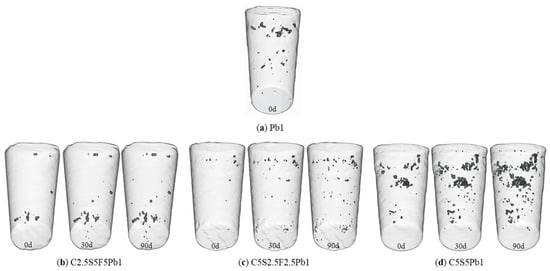 Unsolidified Pb-contaminated soil (Pb1) has many large pores and a certain quantity of “large volume” pores (Figure 14a), indicating that the lead-contaminated soil has large structural defects without solidification. The pores of C2.5S5F5Pb1 and C5S2.5F2.5Pb1 were significantly reduced (Figure 14b,c), suggesting that structural defects of the specimens were significantly improved, a process conducive to improving soil strength and resistance against deformation.