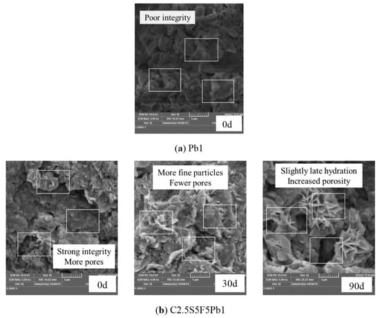 New hydration products (C-S-H gel) [79] were observed, as seen in Figure 15b, under a 90d freeze-thaw cycle, which proved that pollutant precipitates block the hydration reaction while the freeze-thaw cycles promote it. This directly reflects the micro-mechanism of improvement of the UCS of C2.5S5F5Pb1 on freezing and thawing for 90d compared to freezing and thawing for 30d (Figure 5c). In addition, on a 30d freeze-thaw cycle, tiny broken particles, produced by freeze-thaw cycles and hydration, filled the pores, making the soil structure denser. However, when the freeze-thaw cycles increased to 90d, damage to the soil structure was clear, and obvious large pores were generated. These results are in agreement with the various characteristics of the permeability coefficient of C2.5S5F5Pb1 as represented in Figure 13c.