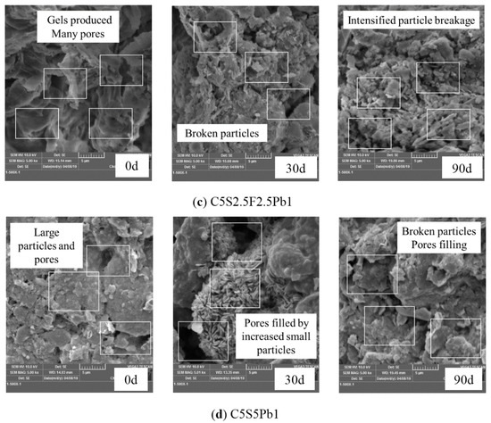 By comparing the SEM images of the Pb-contaminated soil (Figure 15a) with those of the three kinds of Pb-CSCSs prior to freezing and thawing (Figure 15b–d), it is clear that the integrity of soil is significantly improved where soil particles are closely combined by hydration products; thus, the strength of all three kinds of Pb-CSCSs were effectively improved. The formation of large particles also created additional larger connected pores in the solidified contaminated soil, resulting in enhanced soil permeability, increasing the leaching risk of pollutants. All Pb-CSCSs showed a gradual breaking up of consolidated particles, displayed on the macro level as a gradual decrease in their UCS with increased freeze-thaw cycles.