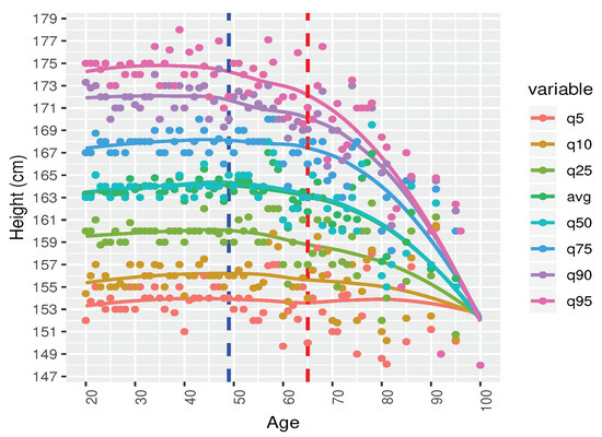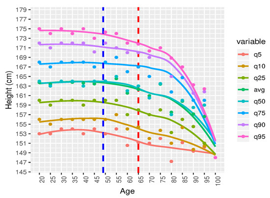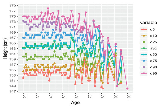 For a further verification, we also display the same height data over age by grouping them by five years. Every point on X-axis aggregates five year data and measure quantiles and average and plot them in Figure 11. We observe the similar tendency but in a clearer fashion.