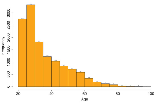 Figure 9 shows the frequency of the data samples. where x-axis represents age groups (year) and y-axis represents the frequency. It is more clear that the prevalence of aging community is less in the chart.