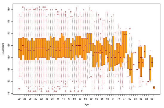 Figure 10 represents the distribution of data based on five number summary (minimum, first quartile (Q1), median, third quartile (Q3), and maximum). It also gives us an idea about the outliers (shown in circles). Median height until the age of 49 do not have much variations. The inter quartile range (IQR), the distance between Q1 and Q3 is not very wide until the age of 49. However, after the age of 49, the IQR is getting wider. As we can understand from the graph, there is no significant change in terms of height up to 49 years of age is observed. The IQR height varies from 158 to 168. However, we can observe few big waves after the age of 50. Without smoothening the curve, it is difficult to conclude any tendency from this graph. Data after 80 years of age are not representative. Only 37 records were archived for this long age gap.