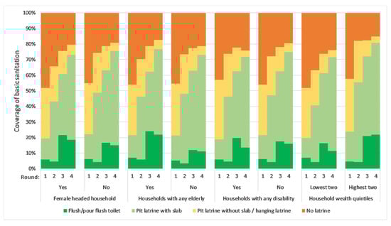 Sustainable Development Goal (SDG) Target 6.2 aims to achieve access to adequate and equitable sanitation and hygiene for all and to end open defecation by 2030, yet 2.3 billion people still lack basic sanitation services and few countries are on track to achieve universal coverage [1,2,3]. Equity of sanitation access for vulnerable groups is a critical priority [1]. Achieving sanitation for all will require sanitation interventions that are able to reach marginalized or vulnerable groups.