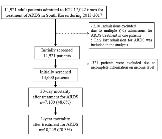 All adult patients (≥18 years old) admitted to a hospital for ARDS-related treatment (International Classification of Diseases; ICD-10 codes of J80*) from 1 January 2013, to 31 December 2017, were included in this study. In cases of multiple admissions (≥2) for ARDS-related treatment per patient, only the most recent admission was included in the analysis. Additionally, cases with incomplete or missing data on income level were excluded.