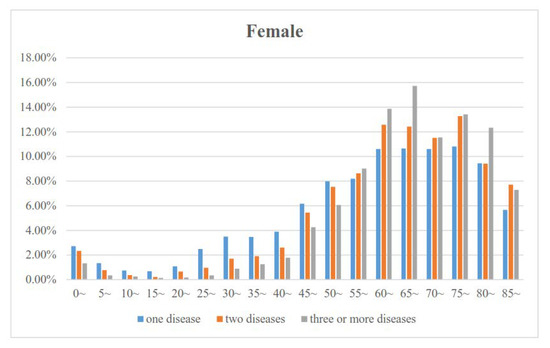 Figure 1 and Figure 2 show the proportions of the numbers of diseases by age for males and females. The proportion of the number of diseases decreased in those 0 to 19 years old, increased in those 20 to 64 years old, and then decreased slowly in those older than 65 years in both males and females. In addition, the proportion of three or more diseases was the lowest and the proportion of one disease was the highest in those less than 55 years old. However, the proportion of three or more diseases was the highest in those 55 to 84 years old. Figure 1 and Figure 2 also show that the age group with the lowest proportion and the age group with the highest proportion were the 10~19 and 60~69 years age groups, respectively.