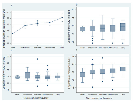 (a) Probability of high levels of mercury in at least one of the matrices evaluated. (b) Box diagram for blood mercury levels according to frequency of fish consumption. (c) Box diagram for mercury levels in urine according to frequency of fish consumption. (d) Box diagram for mercury levels in hair according to frequency of fish consumption.