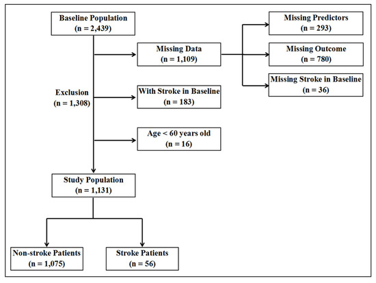 In this study, 2439 participants were included in 2012. After excluding 1109 participants with missing data (293 participants missing for predictors, 36 and 780 participants without stroke status in 2012 and 2014, respectively), 183 participants with stroke in 2012, and 16 participants aged less than 60 years, finally, 1131 participants were included in study. Among the participants, 56 were stroke patients and 1075 were non-stroke participants, as shown in Figure 1. The stroke prevalence was 4.95% for the elderly population in 2014, with men experiencing a much higher prevalence than women (6.76% vs. 3.25%).
