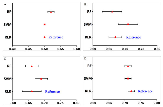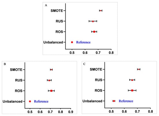 In general, the synthesized performance of machine learning methods improved greatly after the data balancing process, especially in terms of sensitivity and AUC. As shown in Figure 4, after SMOTE balancing, the AUC for RLR reached the maximum value 0.72 (95% CI, 0.71–0.73), and those for SVM and RF both reached 0.71 (95% CI, 0.70–0.72). The performance of other balancing methods (ROS and RUS) also improved considerably (Figures S2 and S3 in the Supplementary Materials).