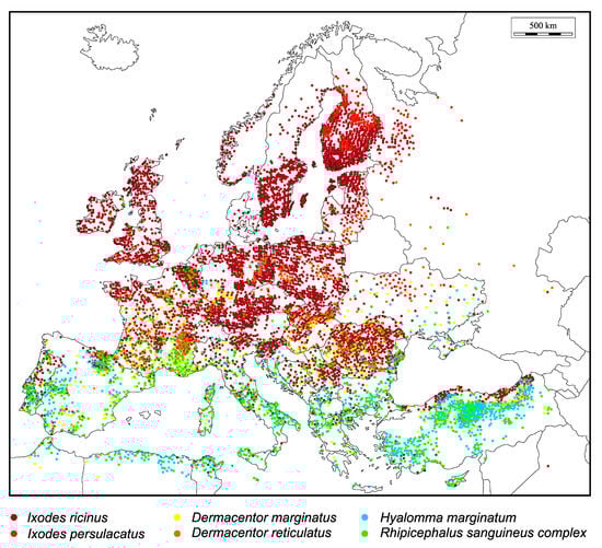 Ticks in Europe: Distribution of six medically and veterinary important tick species in Europe is depicted. The figure shows geographic locations where important species have been reported (as indicated by colored dots) and was prepared according to data from Estrada-Peña et al. [1].