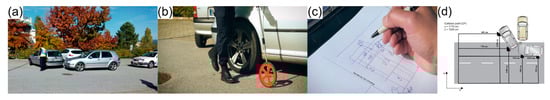 Current data collecting method applied by the Portuguese Public Safety Police (PSP) of Vila Real (Portugal) in a simulated road traffic accident scene: (a) staged traffic accident scene; (b) police officer using a measuring wheel to acquire data; (c) in situ sketch example; and (d) traffic accident scene sketch produced for clarification purposes by using an online platform.