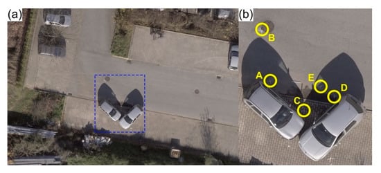 Simulated scenario to determine the best possible compromise between flight parameters for traffic accidents reconstitution (a). The area considered for measurements was of 67 m2, which corresponds to the blue dashed polygon (b), five measuring points are highlighted (A—E).