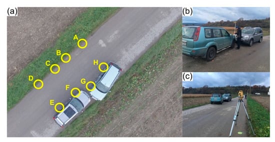 Assessment of different measuring methods in a car accident scenario: (a) aerial view of the road traffic accident scenario, with the eight points (A–H) considered for comparing the measuring methods; measuring distances using (b) the GNSS receiver; and (c) the total station.