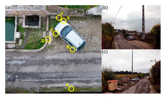 Road traffic accident simulation in a context with poles and aerial cables: (a) aerial view of the road traffic accident scenario, where six control points (A–F) were marked to compare results between the proposed approach and ground-truth measurements; (b) and (c) different perspectives of the accident scene, where the poles and aerial cables are visible.