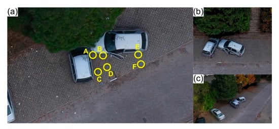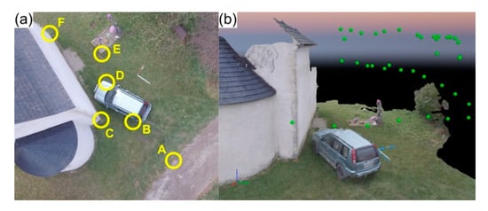 Figure 8a presents this simulated crash scenario and the six points (A–F) marked on the ground for precision assessment. Figure 8b presents the final 3D model obtained through photogrammetric processing of the UAV-based imagery acquired by both the manual and automatic flights.