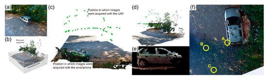 Before the proposed methodology processing stage, the vegetation was removed by defining a sub-region of interest focused on the vehicle (Figure 7b). A total of 50 aerial images were acquired using the UAV, which enabled the computation of a dense point cloud (Figure 7d). As the dense vegetation prevented the reconstitution of one of the vehicles sides, to document that missing part, 17 images from the obstructed area were acquired using the smartphone camera—this process took approximately three minutes—and used to complement the aerial imagery (Figure 7e). Lastly, three measuring points (Figure 7f) were marked on the ground (A–C), to compare the reference measurements and the ones obtained from the resulting point cloud.