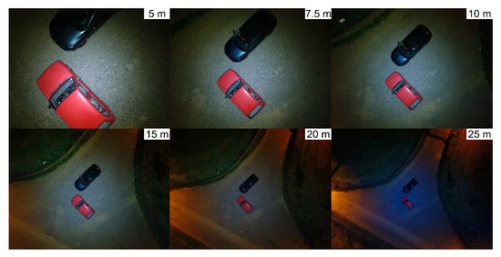 The first simulated road traffic accident scenario under adverse illumination conditions was intended to visually assess acquired aerial imagery. The simulation took place in a suburban area, without direct light from nearby public illumination and involving two vehicles. Relying only on portable illumination coupled to the UAVs, images were taken in the same point at different heights (5 m, 7.5 m, 10 m, 15 m, 20 m, and 25 m) over the scene, as shown in Figure 9. An image was acquired in a manual flight, with the UAVs RGB camera in a nadiral position.