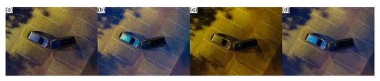 Regarding aerial imagery, several DG autonomous flights were carried out. Each flight had a 70° camera angle and the portable illumination was manually adjusted to this angle. The 25 m height flight—28 images acquired in approximately 5 min and 30 s—was considered for this scenario for two reasons: it is borderline regarding aerial imagery quality and this flight height allows for the presence of most type of obstacles. Figure 11 presents the final orthophoto mosaics focused on the vehicles involved in the simulation, for each aforementioned illumination setup.