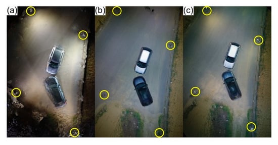 Orthophoto mosaics generated from aerial imagery acquired in an adverse light context: (a) only ground-based illumination; (b) portable illumination coupled to the unmanned aerial vehicle (UAV); and (c) combination of both ground and UAV-coupled illumination. Yellow circles mark the location of the four ground-based illumination units.
