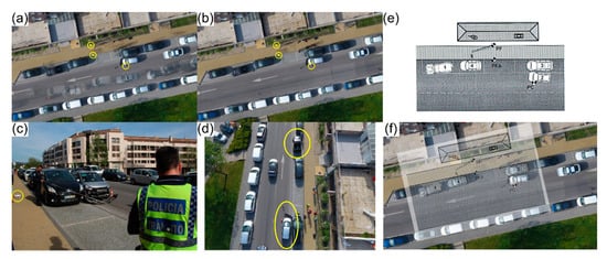 Proposed method applied to a road traffic accident in urban context: (a) orthophoto mosaic generated from the aerial imagery photogrammetric processing; (b) orthophoto mosaic without ghost-like elements; (c) Police officers taking measurements with a tape and the UAV getting ready to take-off; (d) aerial perspective of the scene, yellow ellipses identify the vehicles involved in the accident; (e) PSP’s sketch; and (f) overlap between PSP’s sketch and the generated orthophoto mosaic.