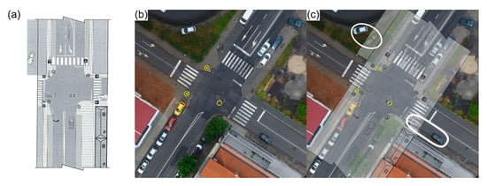 Figure 13c presents an overlap between PSP’s sketch (Figure 13a) and the processed orthophoto mosaic (Figure 13b), both in the same scale. The main noticeable discrepancy regards the position of the vehicles. In a more complex road traffic accident scenario, the proposed approach would provide a more precise reconstitution, with a comprehensive context allowing for different perspectives, precise location of the debris, other elements of interest and the capability of measuring distances between any two points within the scene. Again, the crash scene is fully preserved for both present and future analysis. This urban road traffic accident scenario took approximately 35 min to be documented by PSP, with some impact in the usual traffic flow. With the proposed approach, documenting the entire crash scene took only 2 min, with 5 more minutes spent in assembling the UAV and setting up a proper flight plan.