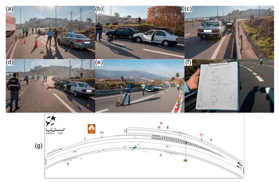 IP4 motorway road traffic accident scenario: different perspectives from the involved vehicles and debris (a, b, c, and d); National Republican Guard officers documenting the accident scene (e); the on-site handmade sketch (f); and scaled sketch produced by GNR in office (g).