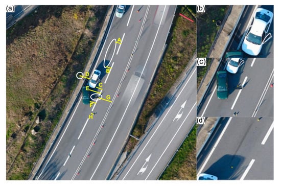 Part of the orthophoto mosaic of the IP4 motorway road traffic accident scenario (a). Both vehicles and other elements of interest (white ellipses): debris (c), skid marks (d), a tire (b). Measurement lines are also identified (A to H).