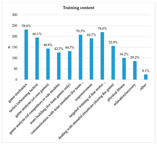 The results show that the composition of the target group is different from the general population: In line with results from previous studies on gaming and eSports [,], the present sample includes predominantly young and well-educated participants. While about half of the sample is still in some kind of educational process, e.g., school or university students, the other half is working part-time or full-time. The question may arise as to whether time spent participating in eSports just exacerbates people’s sedentary behaviour at school, university or the office. However, it should also be considered that eSports, or gaming in general, may offer a possibility to get access to a target group—adolescents and young adults—that is too often overlooked by traditional health campaigns []. For example, promoting the implementation of trained coaches could be a possible approach to integrate holistic and health-promoting training concepts into the daily routines of eSports players. Although research identifying the essential skills for success in eSports is limited, it may be assumed that fitness training and training content from traditional sports may also benefit skills that are necessary for good eSports performance like, e.g., sustained attention [] or reaction time [,]. Right now, about half of the respondents, and predominantly those who compete in official tournaments and leagues, complete structured training but most of it takes place without a coach and almost solely in the digital environment. Bringing these digital skills into the real world by means of practicing specific physical exercises could reduce sedentary behaviour and bring real health benefits [,,]. In this respect, it can be seen as a very positive result that classical strength and endurance exercises are quite frequently represented in this target group. However, only one-third of the sample associates fitness training with the content of a structured eSports training. It seems that the respondents do engage in fitness training but not for the purpose of improving their eSports performance.