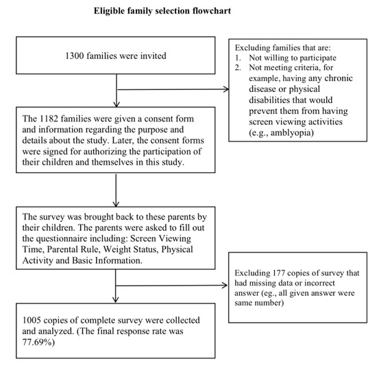 For eligible families, neither children nor their parents have any chronic disease or physical disabilities that would prevent them from having screen viewing activities (e.g., amblyopia). The family health information was provided by parents’ responses and the class teachers. The final response rate was 77.7% (1300 distributed and 1005 collected). The flowchart of selecting eligible families is presented below as Figure 1. The present study protocol has been approved by the Institutional Review Board (IRB) in the Research Ethics Committee of National Taiwan University Hospital (IRB Approval Case No.: 201411081RIND).