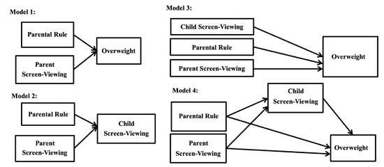 A series of models (Figure 2) were carried out to examine the mediated effect of child screen-viewing; Model 1 tested the associations between parental rule and child overweight; and between parent screen-viewing and child overweight. Model 2 tested the relationships between parental rule and child screen-viewing, and between parent screen-viewing and child screen-viewing. Model 3 tested the association between child screen-viewing and child overweight; Model 4 was an overall model that combined Models 1 to 3.